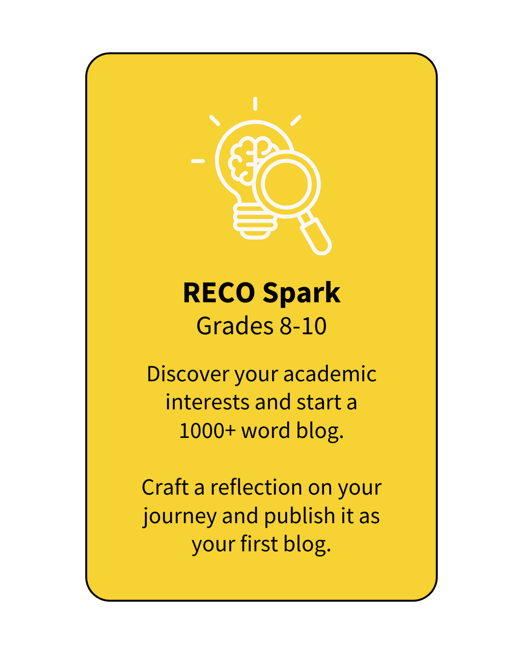 RECO Spark is for students in Grades 8–9 who want to build fundamental skills and kickstart their profile-building journeys. RECO Reads is for students in Grades 10-12 who want to dive deep into a field create a a sophisticated academic project. RECO Writes is for advanced students. Applications for RECO Writes will open in January 2026.